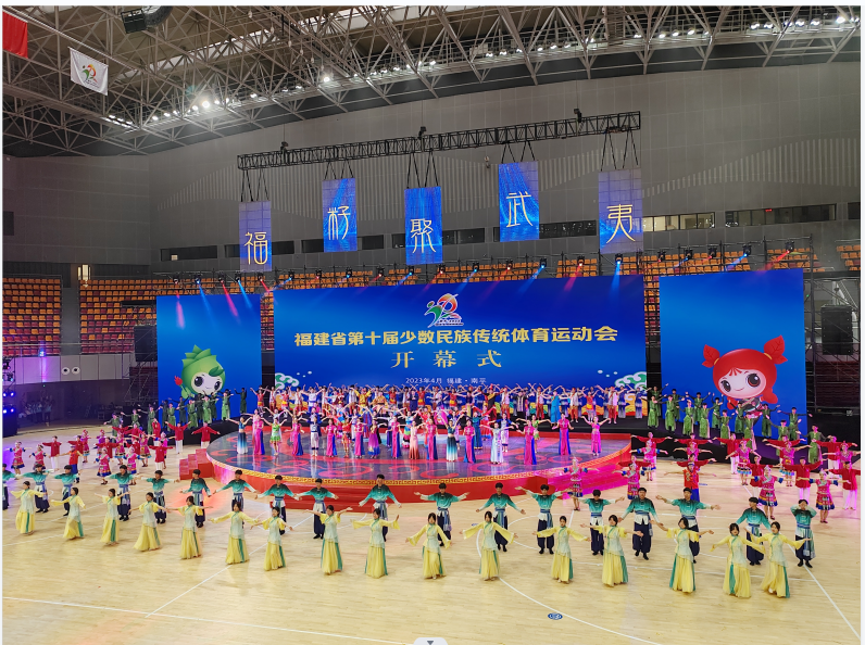 现场来自海峡两岸、八闽大地12个代表队的1300多人齐聚一堂,共襄盛举。记者在开幕式现场看到,在国旗、会旗的引领下,各族运动健儿带着昂扬的斗志、蓬勃的朝气迈步入场,生动展现出各族儿女像石榴籽一样紧紧拥抱在一起的美丽画卷。随后,以“福籽聚武夷 同心爱中华”为主题的大型文艺表演拉开序幕,文艺表演将闽北历史文化和少数民族元素有机地结合起来,在突出闽北特色文化的同时,又展现出海峡两岸同根同源的少数民族风情,整台表演通过“大型情景歌舞诗”的形式呈现给观众。内容丰富、形式多样,接地气、入人心的文艺汇演体现了全省各族人民和睦相处、和衷共济、和谐发展的精神面貌。