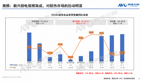 奥维云网数据显示,2023年一季度,厨热(烟、灶、消、洗、嵌、集、电热、燃热)市场规模270亿元,同比下滑2.3%;油烟机、燃气灶、集成灶、洗碗机全渠道累计零售额分别同比-4.9%、-10.1%、+0.5%、+3.1%。