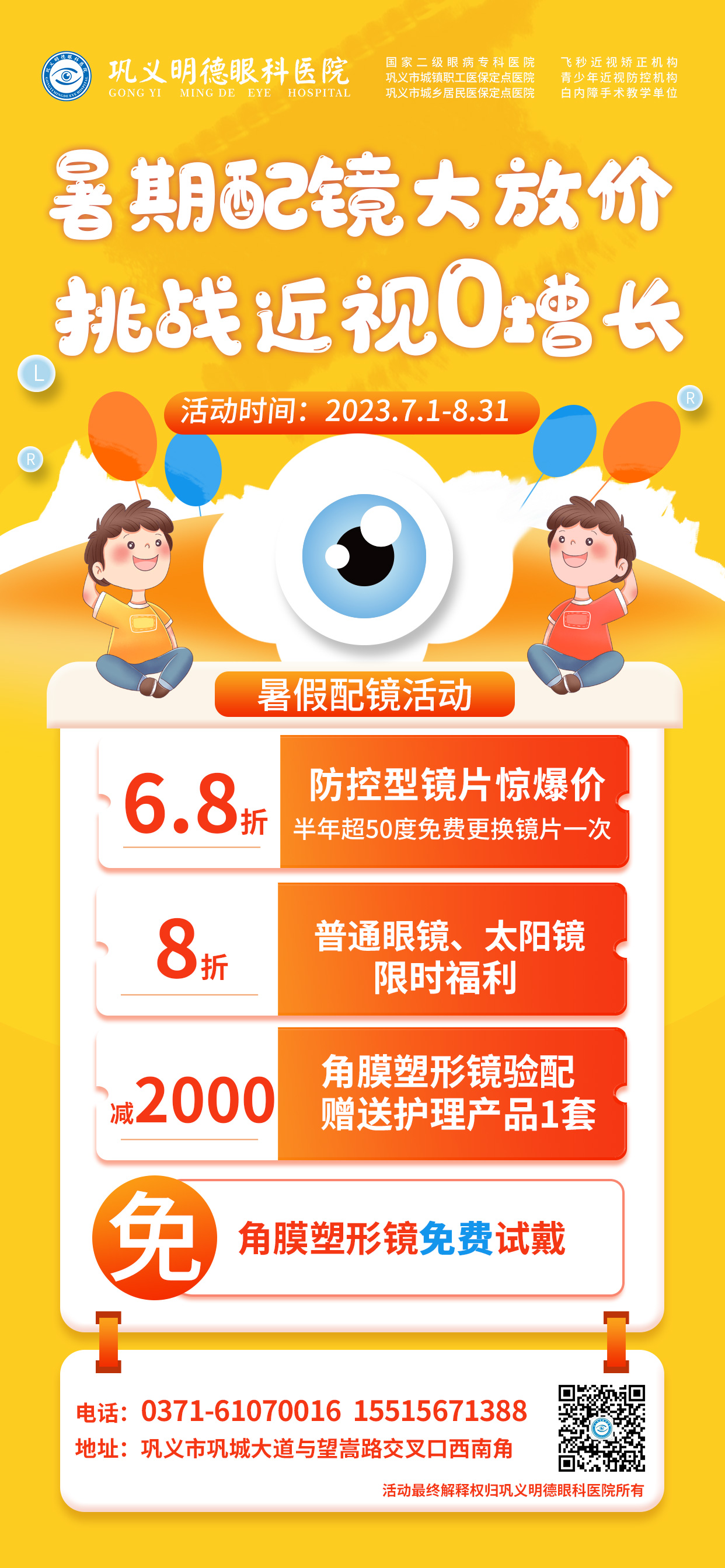 对于那些已经出现了近视状况的孩子们,也不必过多担心,巩义明德眼科医院为了让更多近视患者拜托视力困扰,明德眼科医院倾情推出优惠活动,为您提供专业的眼健康服务,让您告别眼镜的束缚,迎接一个清晰、自信的未来!不再为模糊的视野而烦恼,不再为眼镜的不便而困扰,立即前往明德眼科医院,让我们帮您摆脱近视屈光困扰,迎接一个清晰、自信的未来!