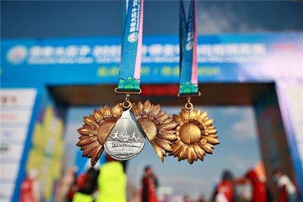 本届赛事的完赛奖牌,以第十师北屯市"向阳花开心向党"为核心创作元素。还通过打开的向日葵设计,体现了"花开"的动感 。
