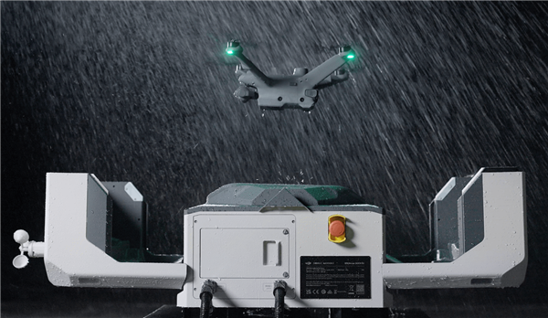 此外,大疆机场2采用了高度一体化设计,整合了内外鱼眼监控相机、环境监测系统、双RTK模块、UPS电源等多个关键模块,它们各自发挥作用,高效地完成各项任务。环境监测系统包括雨量计、风速计、温度计等传感器,能够实时感知环境变化,一旦发现恶劣天气,系统会及时报警或中止飞行任务,有效降低了飞行风险。双RTK天线则保证了机场2的快速进入作业状态,让飞行器无需等待自身RTK收敛即可获取准确的返航位置信息,最快在约45秒内完成桨叶检测并起飞,为执行紧急飞行任务争分夺秒。